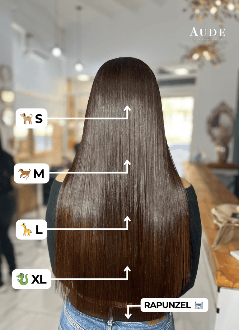 Si la medida desde la raíz hasta más allá de la primera parte del trasero es la longitud de tu cabello, entonces es tamaño XL.